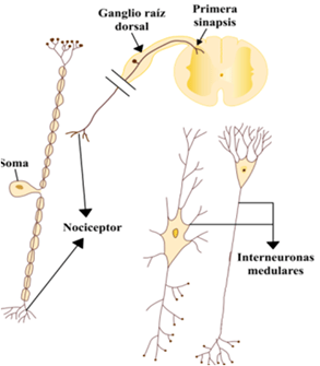 Elsoma del nociceptor (aferente primario) se encuentra en el ganglio de la raíz dorsal del nervio.
