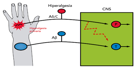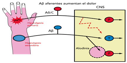 Se muestran ejemplos de la hiperalgesia primaria y secundaria.