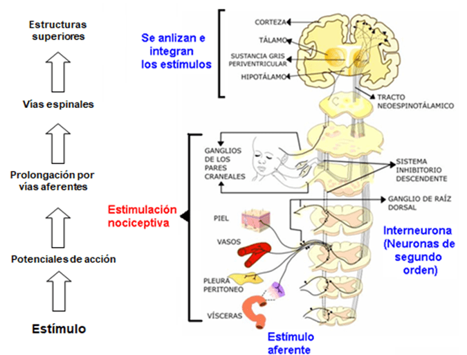 En esta imagen se puede apreciar cómo la actividad eléctrica como consecuencia de un estímulo parte de prácticamente todos los órganos, desde los nociceptores, lo que implica que el fenómeno doloroso puede partir de cualquier parte del cuerpo humano.