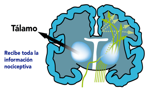 La principal función del tálamo es la de recibir toda la información nociceptiva y distribuirla a la corteza cerebral y los centros subcorticales, donde se generarán todas las respuestas apropiadas o inapropiadas por parte del organismo.